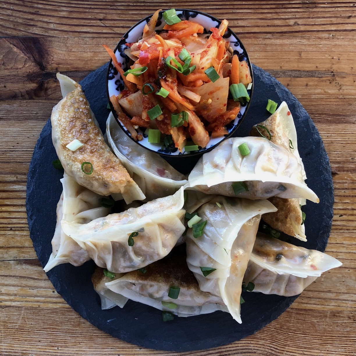 Krõbedad jaapani pelmeenid - gyozad. Täidiseks mahlane kimchi-tofu segu, millele lisavad juustust mekki maitsepärmihelbed.