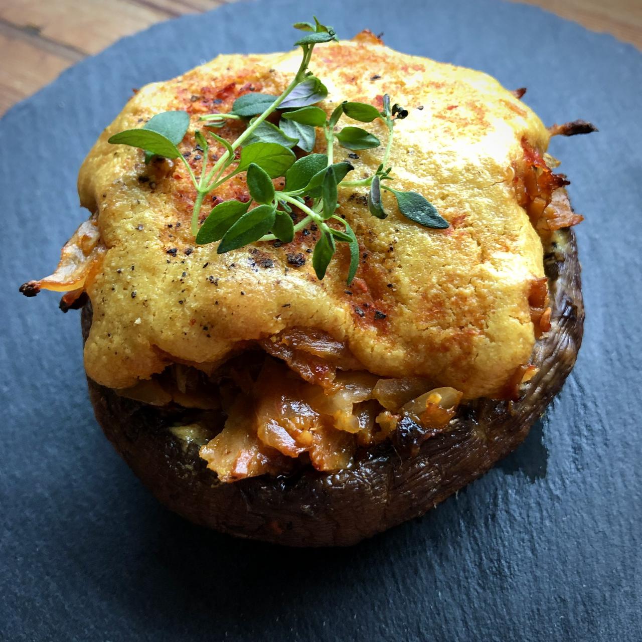 4. Pane mõnus kogus kimchi-vöneri segu tihedalt seente sisse, nirista peale "juustukastet" ning küpseta ahjus pöördõhu režiimil 15 minutit, kuni kaste hakkab pealt pruunistuma. Kaunista rohelisega ja valmistu foodgasmiks!